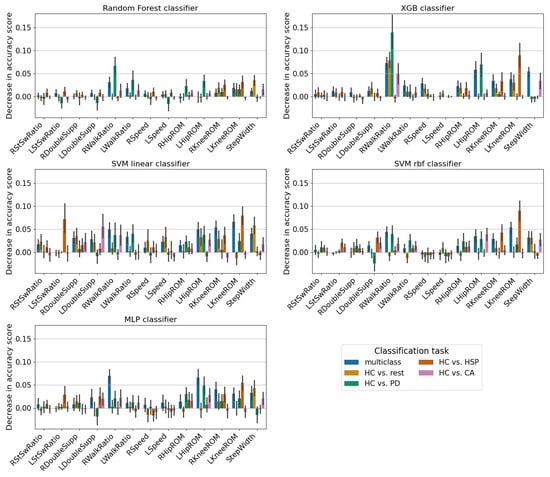 In this regard, XAI methods were used here to enhance the model interpretability by identifying the most influential gait parameters in classification. Figure 3 shows the permutation importance for all the classifiers in different classification tasks.
