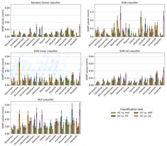 We computed the Shapley values only for the binary classification tasks. In fact, when a multi-class problem is studied with SHAP, the method returns, for each gait parameter, an array of size , with the Shapley value derived by treating the output for each class as the result of a binary classification (in a One-vs-Rest fashion). Moreover, SHAP values can change significantly among the classifiers. To better compare the values obtained for different classifiers, we first computed the average of the absolute SHAP values for every classification task and then normalized this quantity.