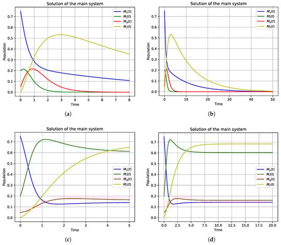 By contrast, when , this indicates the malware propagation impact is increasing over time. Figure 2 demonstrates this increase in impact in the short-term and long-term in Figure 2c and Figure 2d, respectively. Here, the variables either increase or maintain levels, indicating the persistence and spread of the malware. This comparison highlights the critical threshold of in determining the success or failure of malware containment efforts.