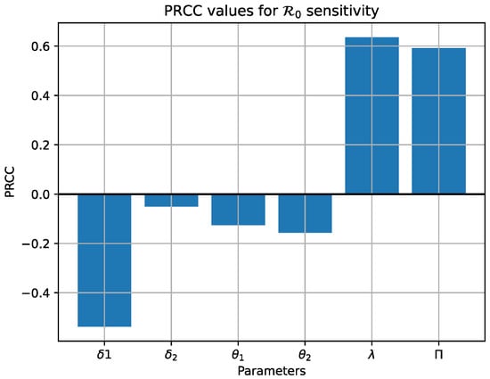 The bars in Figure 3 corresponding to and are positive, indicating a direct correlation with ; as these parameters increase, so does . Conversely, , , , and have negative PRCC values, suggesting an inverse relationship; as these parameters increase, decreases. Notably, has the smallest negative value among the parameters.
