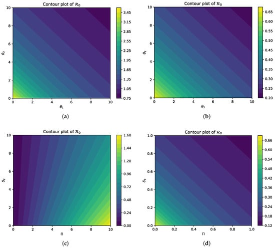 This ensures that and have negative real parts. Combined with , all eigenvalues have negative real parts, as shown in Table 3. By the Routh–Hurwitz criterion, is locally asymptotically stable.