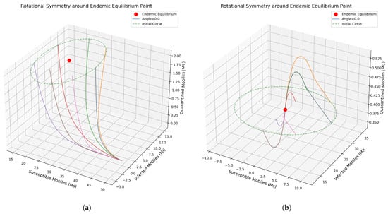 The dynamics of malware propagation, both over time and also under varying conditions of the basic reproduction number , are well illustrated in Figure 2a,b, representing those scenarios where , meaning the malware will eventually be disabled. Figure 2a shows this scenario of a short-term span, and Figure 2b shows this over a long-term span; both are consistent in showing the eventual decline (and eradication) of the malware as a result of effective containment.