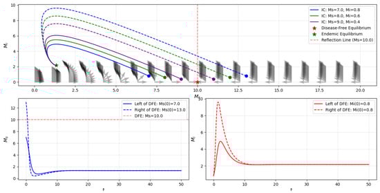 Since and , we have for all values in the feasible region, with equality only at . By LaSalle’s invariance principle, all solutions converge to , proving that the endemic equilibrium is globally asymptotically stable when . □