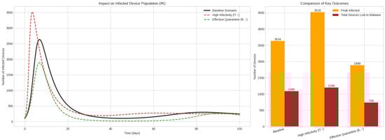 Table 4 values were obtained from (1) malware campaign analyses (Ghost Push, HummingBad [36]) for and , (2) antivirus reports (Google Play Protect, Kaspersky [37]) for , and (3) network statistics (GSMA, Ericsson [38]) for and . Fitted parameters ( and q) were calibrated via Monte Carlo simulations constrained by outbreak case studies [39]. All time-dependent parameters use units of day−1.
