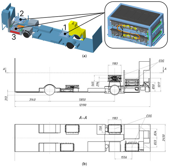When switching from a diesel power unit (together with a gearbox) to an electric one (three battery units of 500 kg each according to the customer’s technical documentation—Figure 1a), the position of the bus centre of gravity (CoG) must be preserved; otherwise, braking, handling, active, and passive safety will be affected. For the long-range BEVs, the number of battery units can be increased to four (Figure 1b), though the new CoG should be minimally changed—this is a conceptual challenge to distribute the masses evenly.