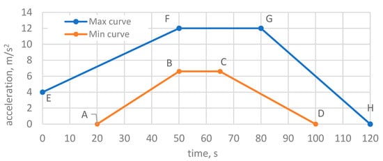 According to R100, the test pulse applied to the battery unit shall be between the “max curve” and “min curve”—an example of a graph of longitudinal acceleration is shown in Figure 2. The corresponding values of acceleration in the intermediate points (moments of impact time) are listed in Table 1.
