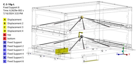 Parametric Ansys model of the “2-10g-L” mode boundary conditions: A–D are the vertical displacement constraints; E, F are masses of batteries; G–F are the bolted joints.