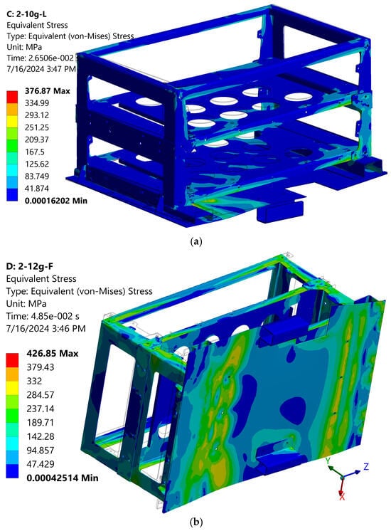 Von Mises stress maps of the battery unit #2 in the following modes: (a) “2-10g-L” (left pulse direction); (b) “2-12g-F” (front pulse direction).