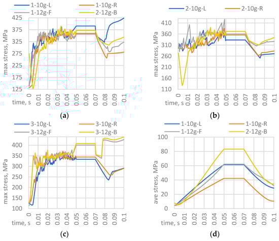 The graphs (Figure 5a–c) show dense fluctuations of σmax during the period of 0–0.05 s, which corresponds to the zone of acceleration growth according to the graph of Figure 2. There are at least two reasons for such behaviour: the transients cause the σmax locations to migrate during the experiment; plastic deformations change the model at each of the 300 substeps (threshold applied in Ansys). The processes stabilise from 0.05 s, since the acceleration does not change, and after 0.07 s it drops to zero. However, in some modes, this did not cause stress. This indicates the presence of residual stresses, which also turned out to be maximum during the experiment at some modes: “1-10g-L”, “3-12g-F”, and “3-12g-B” showed σmax exactly at 0.1 s. The average stress σave behaviour is similar for all modes; therefore, it is enough to demonstrate a typical graph based on model #1 (Figure 5d) as an example—it echoes the regulative graph of acceleration according to R100 (Figure 2).