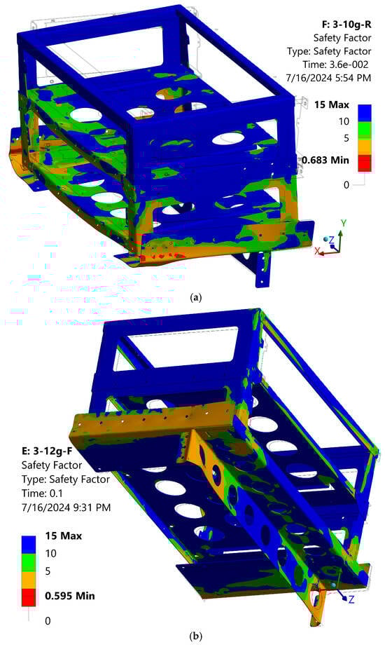 Safety Factor (SF) maps in different modes: (a) “3-10g-R”; (b) “3-12g-F”.