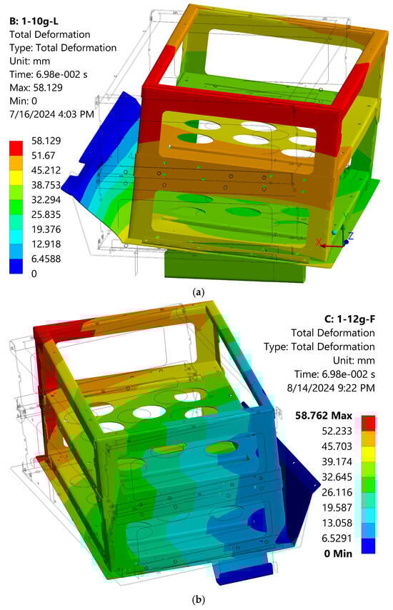 Total deformation in different modes: (a) “1-10g-L”; (b) “1-12g-F”.