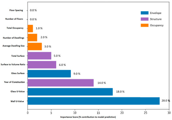 Figure 3 presents the feature importance analysis results, illustrating the relative contribution of each building characteristic to energy consumption prediction. The horizontal bar chart clearly demonstrates that envelope components—particularly wall U-values (28%), glass U-values (18%), and glass surface percentage (12%)—have the most substantial impact on energy performance. This visualization quantifies the relative influence of each parameter, showing that the top three factors alone account for approximately 60% of the model’s predictive power. Notably, occupancy-related parameters contribute minimally (5% combined), suggesting that physical building characteristics offer significantly greater leverage for energy efficiency improvements. The color-coded categorization further enhances interpretability by grouping similar architectural elements, enabling stakeholders to identify which building systems present the most promising retrofit opportunities. This visualization serves as a critical decision-support tool, allowing building owners and policy makers to direct limited resources toward modifications with the highest potential impact. The ranking of feature importance in Figure 3 guided the identification of a digital representative building and the selection of retrofit strategies in the subsequent sections.