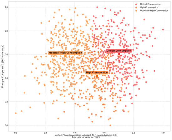 The optimal number of clusters (k = 3) was determined using the elbow method, which identified a clear inflection point in the within-cluster sum of squares curve, and validated through silhouette analysis, which yielded a score of 0.64—indicating well-differentiated and cohesive clusters. This outcome is also consistent with the findings of Yilmaz et al. [37], who reported that k = 3 offered the best cluster quality for electricity usage profiles in residential buildings. To visualize the cluster structure and further assess validity, principal component analysis (PCA) was applied to project the high-dimensional feature space onto two principal components. The resulting segmentation—Critical, High, and Moderate–High clusters—captures distinct patterns in building energy behavior, supporting strategic retrofit prioritization. As shown in Figure 4, this data-driven segmentation reveals that nearly 75% of buildings fall into the Critical and High categories, emphasizing the value of clustering for guiding resource allocation and targeted intervention in the energy transition process.