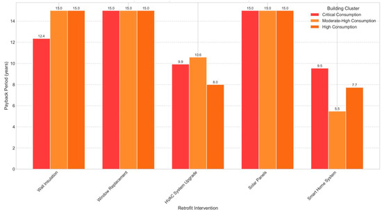 Figure 5 presents the payback period for each retrofit intervention across the three building clusters. This visualization reveals substantial variations in the time required to recover initial investments, ranging from approximately 5.5 years (Smart Home Systems in Moderate–High-consumption buildings) to over 15 years (Window Replacement across all clusters). HVAC System Upgrades consistently demonstrate favorable payback periods (8.0–10.6 years) across all clusters with High-consumption buildings showing the shortest recovery time (8.0 years).