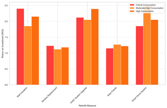 Figure 6 displays the ROI for each retrofit intervention across the three building clusters, providing a direct measure of economic efficiency. The highest ROI values are observed for Wall Insulation in Critical-consumption buildings (2.40), HVAC System Upgrades in High-consumption buildings (2.39), and Smart Home Systems in Moderate–High-consumption buildings (2.48).