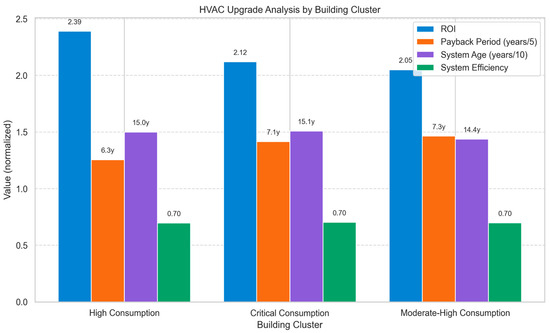 Figure 7 presents a detailed analysis of HVAC System Upgrades across the three building clusters, comparing ROI, payback period (years/5), system age (years/10), and system efficiency. This visualization effectively demonstrates the correlation between system characteristics and economic performance. High-consumption buildings exhibit the highest ROI (2.39) despite having intermediate system age (15.0 years) and identical efficiency (0.70) to other clusters, suggesting that other factors such as usage patterns and envelope interaction significantly influence upgrade benefits.