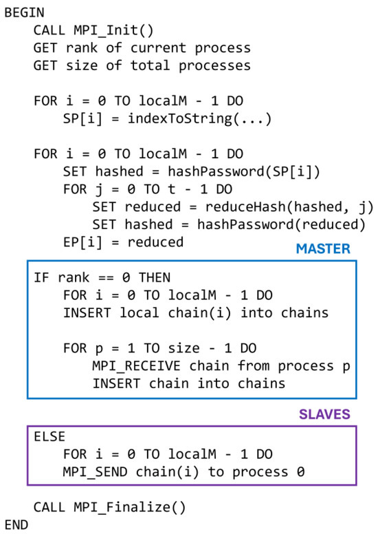 Our proposed method’s contribution is a modified and improved implementation for parallelization of rainbow tables using the MPI standard based on the structure of the master-slave approach, which is more efficient and convenient for this task. The approach differs from the traditional master-slave model by introducing a modification in the task distribution: instead of the master distributing starting points to each slave process, each process generates them independently, which is more efficient. This design eliminates the need for the master to coordinate task distribution, which is a well-known performance bottleneck in traditional MPI-based master-slave parallelization models [13,14]. As a result, our method significantly reduces inter-process communication, improves scalability and maintains high parallel efficiency even with limited computational resources.