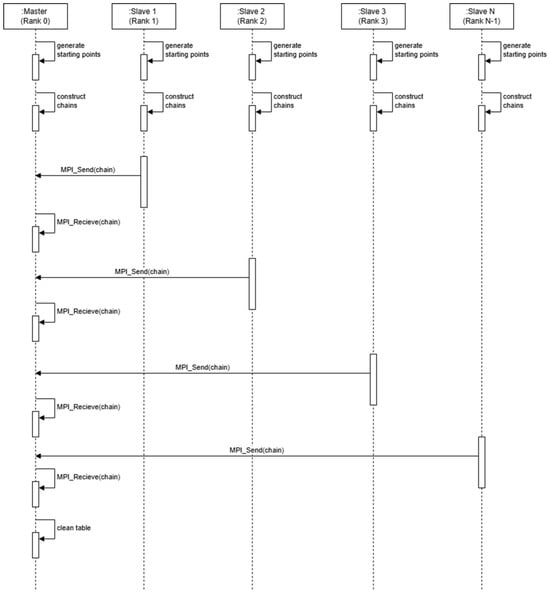 A key factor influencing the performance of MPI-based implementations is the number of communications required, which is directly dependent on the number of processed chains, as each process generates chains independently, unlike the referenced paper’s [10] approach. In the referenced implementation, there are additional communications related with tasks distribution, which are eliminated in our proposed implementation. Our approach eliminates this communication overhead by avoiding explicit task distribution and as a result reduces the bottleneck in the master process.