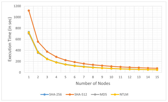 Figure 3 presents the results for a 10,000-by-20,000 table, while Figure 4 presents the results for a 50,000-by-40,000 table. As depicted in both figures, the execution time decreases significantly with an increasing number of nodes, highlighting the efficiency of parallel computing in reducing computational overhead. Among the hash functions, SHA-512 has the highest execution time (1119 s for medium table and 11,229 s for large table) with a single node, followed by SHA-256 (730 s for medium table and 8888 s for large table), MD5 (704 s for medium table and 7134 s for large table) and NTLMv2 (722 s for medium table and 7148 s for large table). However, as the number of nodes increases, the execution time difference between the hash functions decreases, with all four functions converging to similar execution times beyond 10 nodes.