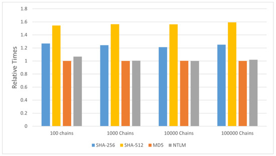 The results of this experiment are presented in Figure 5, which illustrates the relative execution times for generating rainbow tables using four cryptographic hash functions, SHA-256, SHA-512, MD5 and NTLMv2, with varying counts of chains. The values shown in the figure are relative to the fastest algorithm in each group. The x-axis represents the number of chains, while the y-axis shows the relative execution time. As shown in the figure, SHA-512 consistently exhibits the highest relative execution time, reflecting its greater computational complexity, while MD5 and NTLMv2 perform much faster, as expected due to their algorithmic weaknesses. SHA-256 occupies the middle ground.