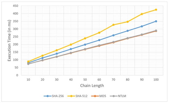 First, we can notice that as the chain length increases, the execution time for all four hash functions also increases. However, the rate of increase differs from one hash function to another. SHA-512 exhibits the steepest slope, indicating a higher computational cost compared to the other hash functions. MD5, on the other hand, has the shallowest slope, suggesting the lowest computational overhead. The execution times for SHA-256 and NTLMv2 fall between those of SHA-512 and MD5, with NTLMv2 consistently below SHA-256 across all chain lengths.