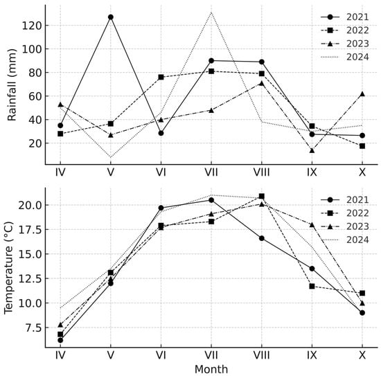 Meteorological data were recorded using an automated weather station throughout the April–October growing seasons. Rainfall ranged from 525.5 mm to 561.5 mm, with notable variability in May precipitation (Figure 1). Mean temperatures varied from 6.2 °C in April to over 21 °C in July/August. The driest year was 2024 (8 mm rainfall in May), potentially influencing crop development and yield.