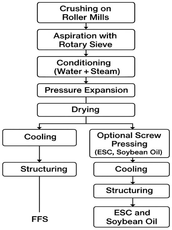 To reduce the oiliness of the final product, modifications were introduced after preliminary drying, directing the soy expandant to screw pressing, followed by further drying and structuring. The soybean processing described in this study was conducted on a pilot-scale industrial line operated by Agrolok Sp. z o.o. (Poland), a private-sector partner in the national Industrial PhD Program (“doktorat wdrożeniowy”), of which this publication is a direct outcome. The company collaborated on the design, execution, and technical validation of the ESC and FFS production processes.