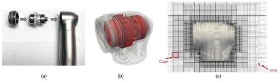 Three-dimensional (3D) geometry of the air turbine handpiece (ATH) and computational mesh generation for fluid dynamics simulations. (a) Internal components of the ATH used in this study; (b) high-resolution 3D reconstruction of the ATH based on micro-CT imaging. The body (gray) and rotor cartridge (red) are shown separately to highlight the complex internal geometry; (c) computational grid generated using the building cube method (BCM), which enables efficient domain decomposition into uniform cubes suitable for high-resolution simulation.