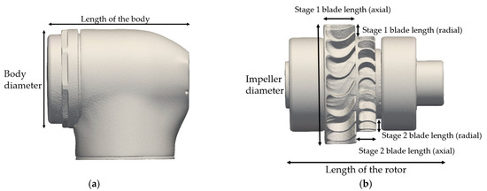 To optimize computational efficiency, we conducted simulations using a supercomputer. Our computational domain included both the interior and surrounding environment. The computational parameters are listed in Table 2, and key geometric dimensions of the ATH are shown in Figure 2. The inlet pressure was set to 3.06 atm and the rotational speed was fixed at 320,000 rpm, representing the actual operating conditions observed in the dental clinic. Using the BCM, we generated the computational grid for large-scale simulations within minutes. The simulation conditions were matched to the experimental setup to accurately reflect actual operational conditions, including inlet/outlet pressures and rotational speed. A fine mesh with a spacing of 0.025 mm was applied near the ATH to capture complex flow details. The total mesh cell count reached 100 million, offering precise information on critical regions, such as the gap between the head body and rotor and the region near the airfoil of the impeller (Figure 1c). Although a full grid independence study was not performed due to the high computational cost associated with the mesh size (>100 million cells), the fine spatial and temporal resolutions were validated by the excellent agreement between simulated and experimental results (as discussed in Section 3.3). The time step size was set to 2 × 10−7 s to satisfy the CFL condition for numerical stability near the impeller region, allowing a Nyquist frequency of 2.5 MHz, which is significantly higher than the highest observed acoustic frequency (~21 kHz). This confirms the adequacy of the chosen computational settings for resolving relevant aeroacoustic phenomena.