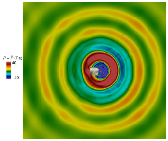 We achieved a transient simulation that captures the pressure fluctuation in the ATH. Figure 5 presents the instantaneous pressure fluctuation, , surrounding the ATH head, which represents the acoustic field. It should be noted that the head body of the ATH was fully included in the computational domain, and its shielding effect was accounted for in the simulation. The contours reveal that the primary noise source is located at the front of the ATH, where concentrated pressure fluctuations occur. The pressure fluctuation magnitude is within 100 Pa (ranging from −40 to 40 Pa), approximately 100 times smaller than the dominant pressure generated by the rotational speed at the airfoil tip of the impeller.