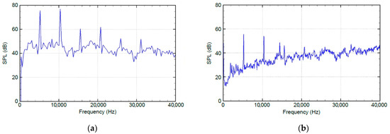 We validated the simulation results by comparing them with experimental measurements. To investigate the acoustic characteristics, an FFT was applied. Figure 6a presents the FFT analysis of the simulated noise, recorded by a virtual microphone placed 10 cm in front of the ATH head at a rotational speed of 320,000 rpm. Figure 6b illustrates the FFT analysis result (sampling points n = 2048, Hanning window) from the actual experiment at 320,000 rpm.