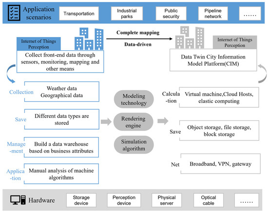 After entering the 21st century, with the improvement of computing power and the development of big data technology, digital twins gradually expanded to the field of urban management [22]. In the early 21st century, the concept of smart cities gradually emerged, and various places began to explore how to use information technology to improve urban management efficiency and quality of life. Digital twin technology became an important tool in this trend. By the 2010s, the application of digital twins in cities began to receive wider attention. The virtual model of the city was no longer a static three-dimensional model but a dynamic system integrating multiple technologies, such as sensor data, real-time monitoring, and simulation prediction. At present, the application scenarios of digital twins have relatively mature practical cases in the fields of transportation, parks, urban emergencies, and so on [23]. The basic technology platform architecture of digital twin cities is shown in Figure 1. Cities such as Singapore and Amsterdam took the lead in realizing the application of digital twins, helping urban managers make better decisions.