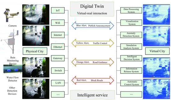 Qiang Li [24] proposed an urban digital twin model based on digital twin technology, which includes five modules—physical city, virtual city, intelligent service, twin data, and virtual–real interaction—and established an urban flood disaster assessment and early warning digital twin system (Figure 2), which helps to realize the functions of automatic monitoring and early warning of urban flood disasters, real-time intelligent command and dispatch, and improving the capabilities of existing cities in flood disaster assessment, early warning system perception, dynamic response, and real-time decision-making.