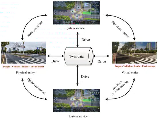 Zhaohui Wu et al. [29] proposed a digital twin architecture of highway traffic. Through this architecture, a digital twin platform for highway traffic supporting “state perception–digital experience-aided decision-optimization control” was established and applied to road engineering projects in Nanjing, Wuxi, Dalian, and other cities. Figure 3 shows the Digital Twin System Architecture of Highway Traffic.