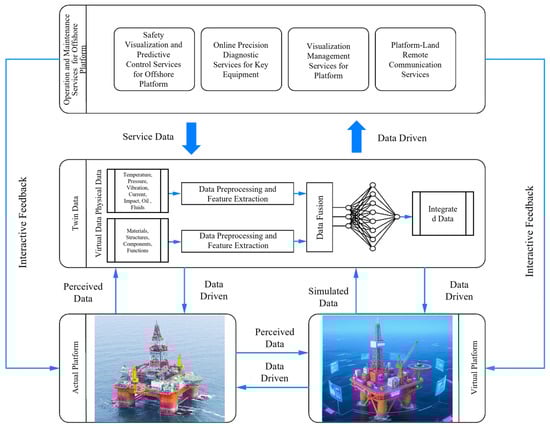 China National Offshore Oil Corporation (CNOOC) has developed an intelligent system for semi-submersible drilling platforms based on DT technology. This system achieves intelligent safety diagnostics, condition-based early warning for critical equipment, visualized safety control, etc. [45,46]. As illustrated in Figure 8, the drilling platform digital twin architecture comprises the physical drilling platform, virtual counterpart system, twin data repository, offshore platform O&M services, and interconnected subsystem networks.
