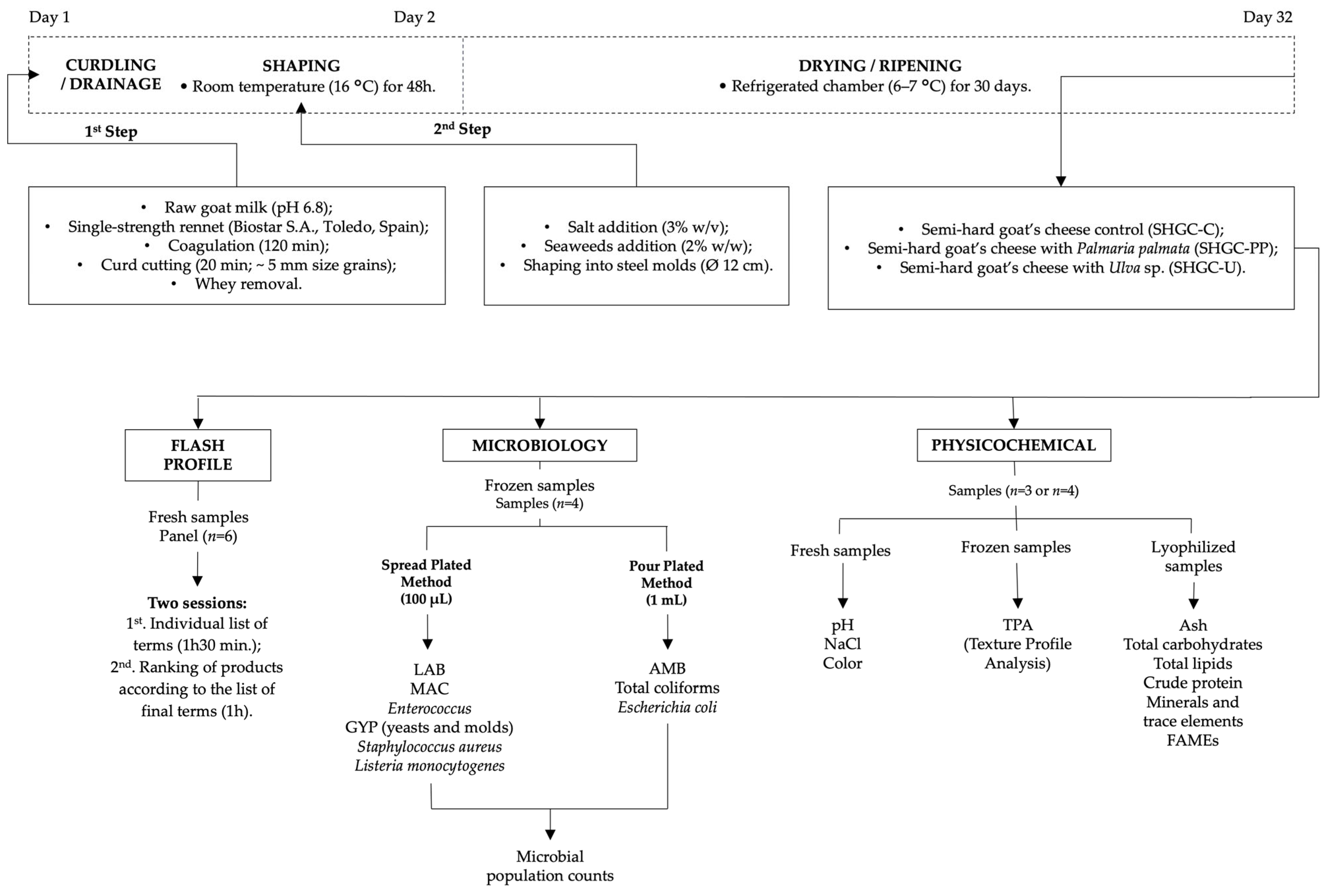 Campos, B.M.; Moreira-Leite, B.S.; Salgado, A.; Ramalho, E.; Marmelo, I.; Malfeito-Ferreira, M.; de Sousa, P.H.M.; Henriques, A.; Noronha, J.P.; Diniz, M.S.; et al. Development of Innovative Mediterranean-Style Semi-Hard Goat’s Cheese Supplemented with Seaweeds (Palmaria palmata and Ulva sp.) and Its Characterization. Appl. Sci. 2025, 15, 8232. https://doi.org/10.3390/app15158232