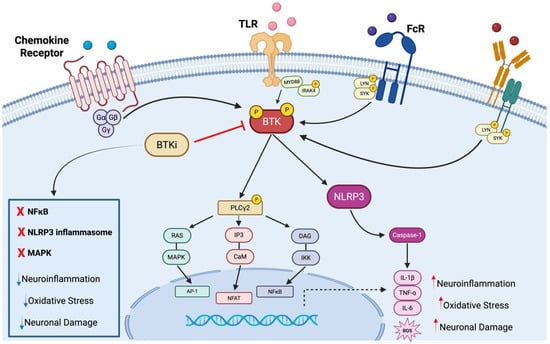 BTK is a member of the Tec family of non-receptor tyrosine kinases, playing a pivotal role in signal transduction in various hematopoietic cell types, as previously mentioned. Structurally, BTK comprises five functional domains: a pleckstrin homology (PH) domain, a Tec homology (TH) domain, Src homology 3 (SH3) and SH2 domains, and a catalytic kinase domain (SH1) [16]. Each domain contributes to BTK’s localization, interaction with adaptor proteins, and enzymatic activity. For instance, the PH domain enables membrane recruitment through binding to phosphatidylinositol-3,4,5-trisphosphate (PIP3), a process essential for BTK activation upon receptor stimulation [17]. Upon membrane translocation, BTK is phosphorylated at Tyr551 by upstream Src-family kinases, followed by autophosphorylation at Tyr223, a critical step for full catalytic activation [18]. BTK is most prominently expressed in B lymphocytes, where it mediates BCR activation triggering multiple pathways such as PLCγ2-mediated calcium mobilization, PI3K-AKT signaling, and MAPK cascades, leading to B-cell proliferation, differentiation, and survival [19]. In particular, the antigen interaction with BCR causes activation of Src-family kinases, among which Lyn phosphorylates immunoreceptor tyrosine-based activation motifs (ITAMs) on Igα/Igβ, leading to recruitment of BTK via its SH2 domain [20,21]. Membrane-bound BTK is activated through phosphorylation at Tyr551 and proceeds to phosphorylate PLCγ2, a crucial step that leads to intracellular calcium influx and the activation of downstream transcription factors such as NF-κB, NFAT, and AP-1 [19]. These events drive gene expression programs involved in B-cell activation and antibody production. However, BTK expression is not limited to B cells. As mentioned above, it is also present in myeloid cells including monocytes, macrophages, dendritic cells, and microglia, the resident macrophages of the CNS, where it regulates innate immune responses. In these cells, BTK acts downstream of Fcγ receptors and TLRs, mediating activation of NF-κB and MAPKs, which promote pro-inflammatory gene expression [22]. Upon ligand recognition, these receptors recruit adaptor proteins such as MyD88 and SYK, which in turn activate BTK. BTK then participates in the formation of signalosomes that activate the IKK complex, leading to NF-κB nuclear translocation and transcription of inflammatory mediators such as tumor necrosis factor α (TNF-α) and interleukins (ILs) 1β (IL-1β) and 6 (IL-6) [23,24]. Additionally, BTK is implicated in NLRP3 inflammasome activation in microglia and macrophages, further linking it to a neuroinflammatory pathology [25]. In particular, BTK signaling promotes the cytoskeletal rearrangements required for phagocytosis, as well as microglial metabolic polarization, favoring glycolysis and pentose phosphate pathway activity, thereby enhancing ROS generation and sustaining the microglial inflammatory phenotype. By standing at the intersection of innate immune signaling and metabolic control, BTK amplifies and maintains microglial activation [26]. The involvement of BTK in these signaling networks suggests that its dysregulation can amplify maladaptive immune responses. Indeed, hyperactive BTK signaling has been associated with heightened inflammatory cytokine production, ROS generation, and microglial priming, all features commonly observed in neurodegenerative diseases [27,28]. The convergence of BTK signaling with key inflammatory pathways such as NF-κB, MAPK, and inflammasome activation underscores its role as a central node in neuroimmune signaling. Importantly, these pathways are dysregulated in neurodegenerative diseases, where persistent activation of microglia sustains a chronic pro-inflammatory environment. Thus, targeting BTK may disrupt multiple pathogenic cascades simultaneously, offering a multifaceted approach to neuroinflammatory modulation (Figure 1).