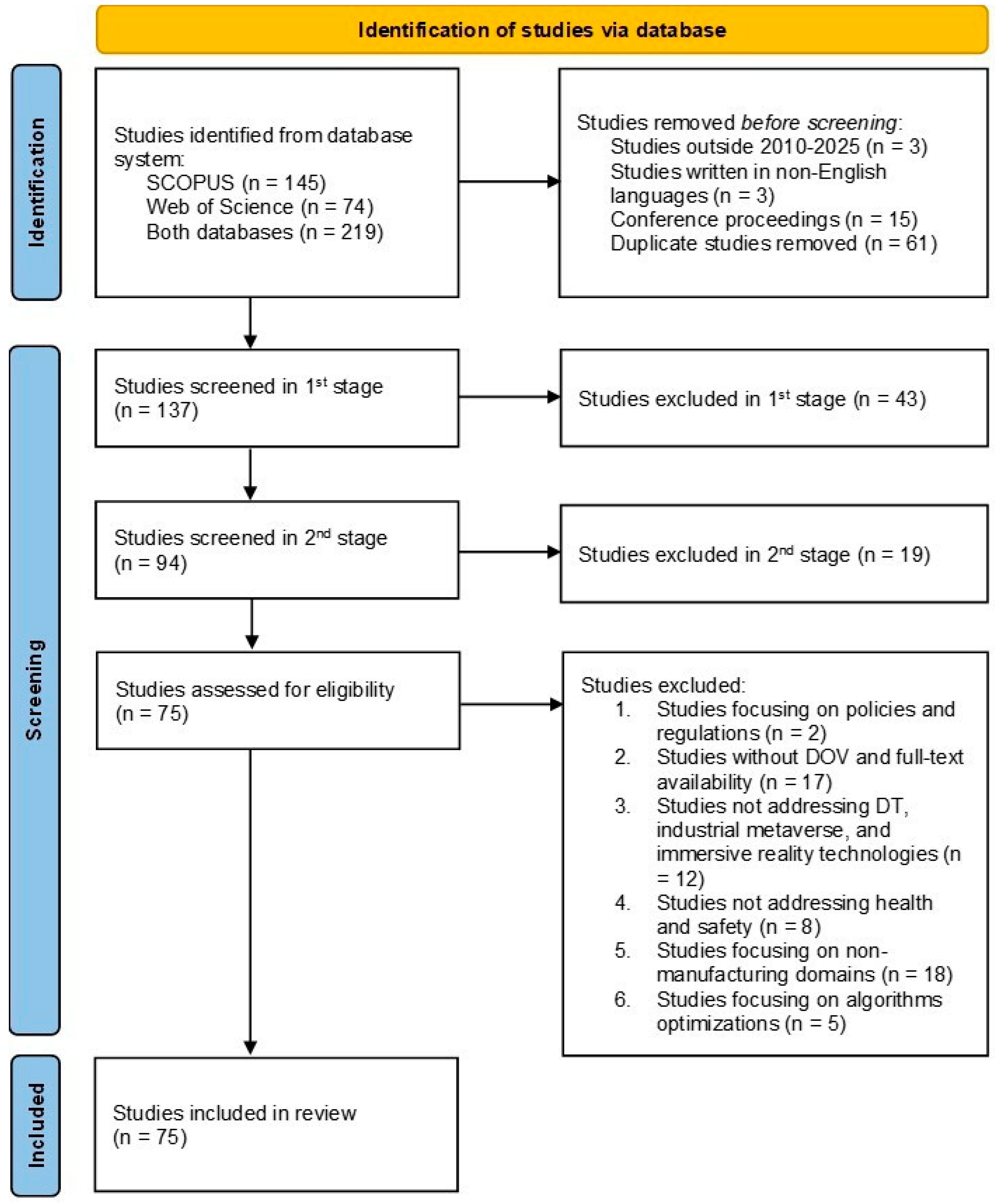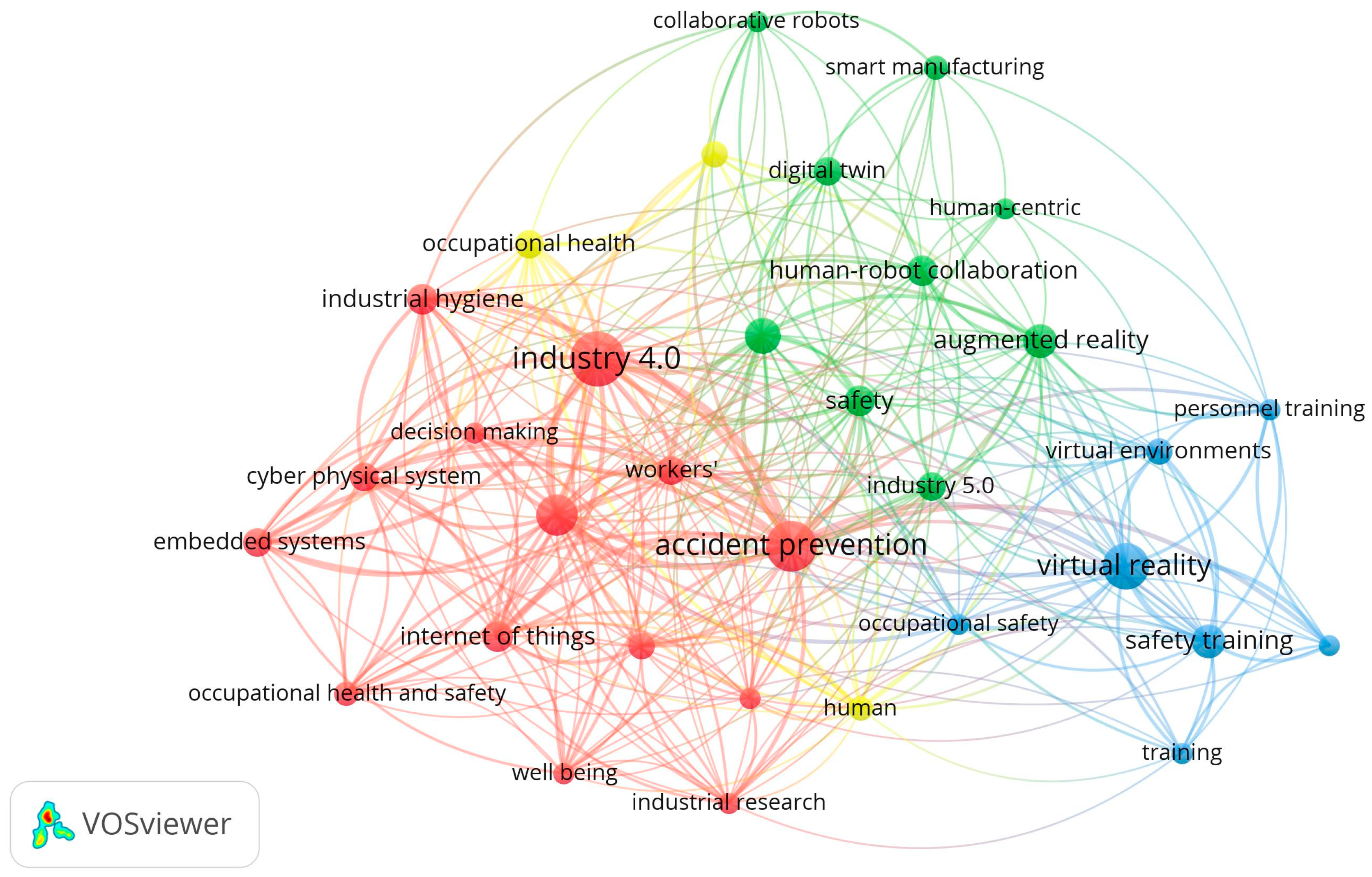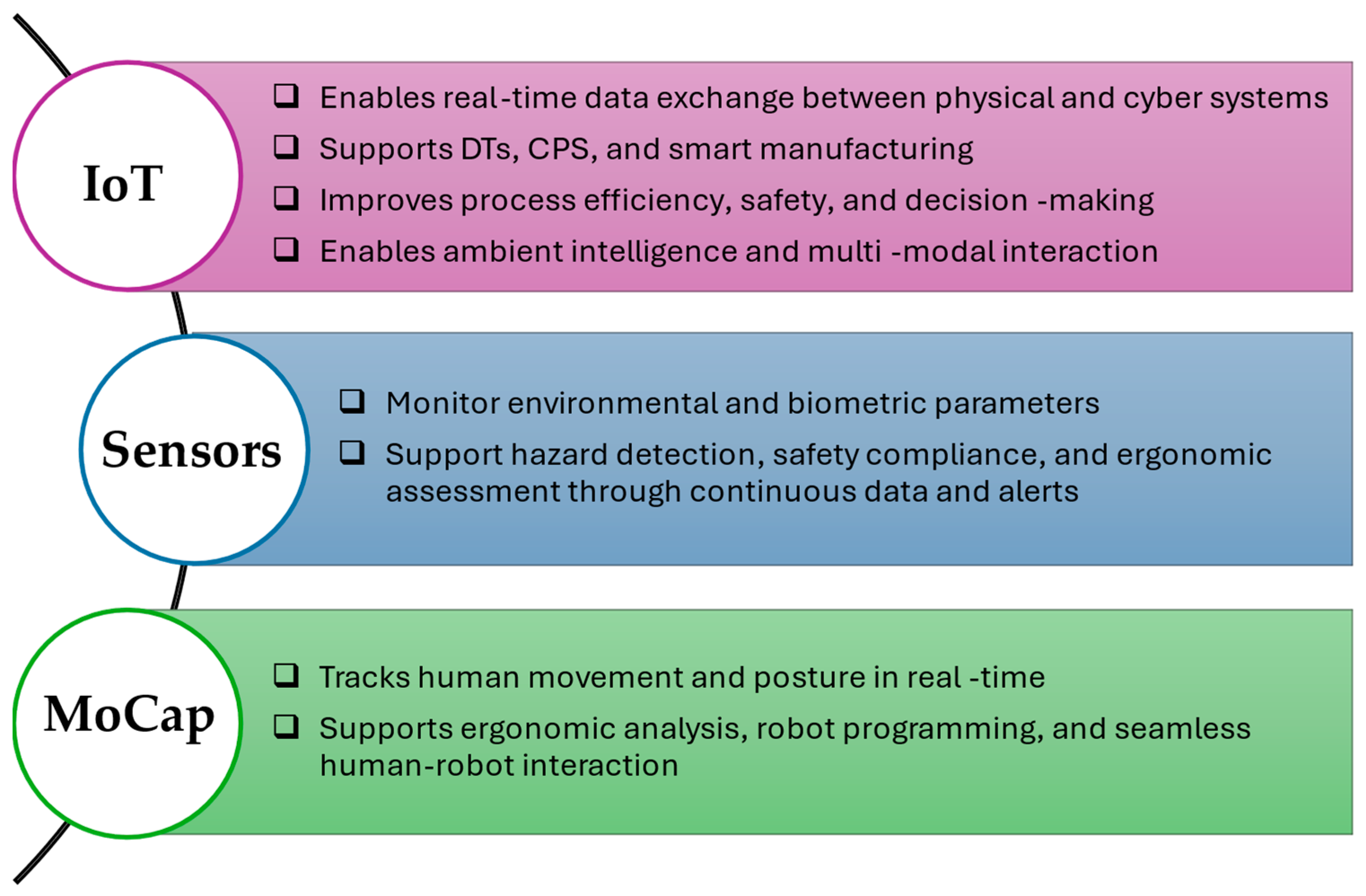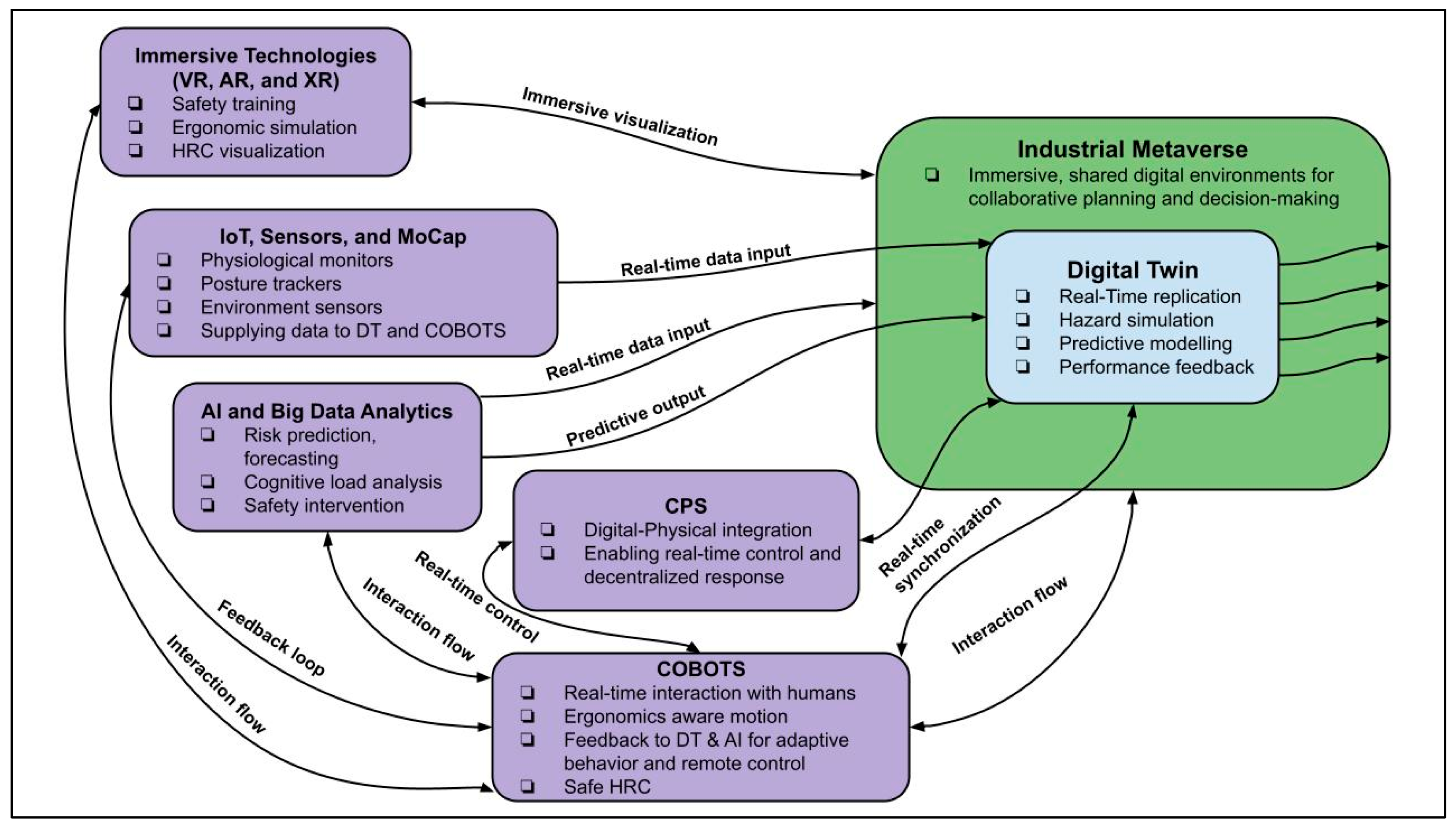 Section 4.1. RQ1 was examined through the application of DTs, IoT, and sensors, which enable real-time modeling of work environments and ergonomic risk assessment. RQ2 is addressed by exploring how the IM, along with immersive technologies such as VR and AR, supports immersive safety training and virtual collaboration. RQ3 focuses on the integration of DT, IM, IoT, AI, CPS, and COBOTS into a unified advanced digital ecosystem that enhances OHS outcomes using predictive intelligence. RQ4 highlights the benefits of immersive technologies in improving worker engagement and enabling real-time adaptation to dynamic environments. Lastly, RQ5 addresses the challenges associated with implementing these advanced systems, particularly those related to technological complexity, worker trust, and financial constraints. Together, these responses provide a comprehensive understanding of how emerging technologies can be strategically aligned to support intelligent, human-centric safety management in smart manufacturing and advance towards Industry 5.0.
