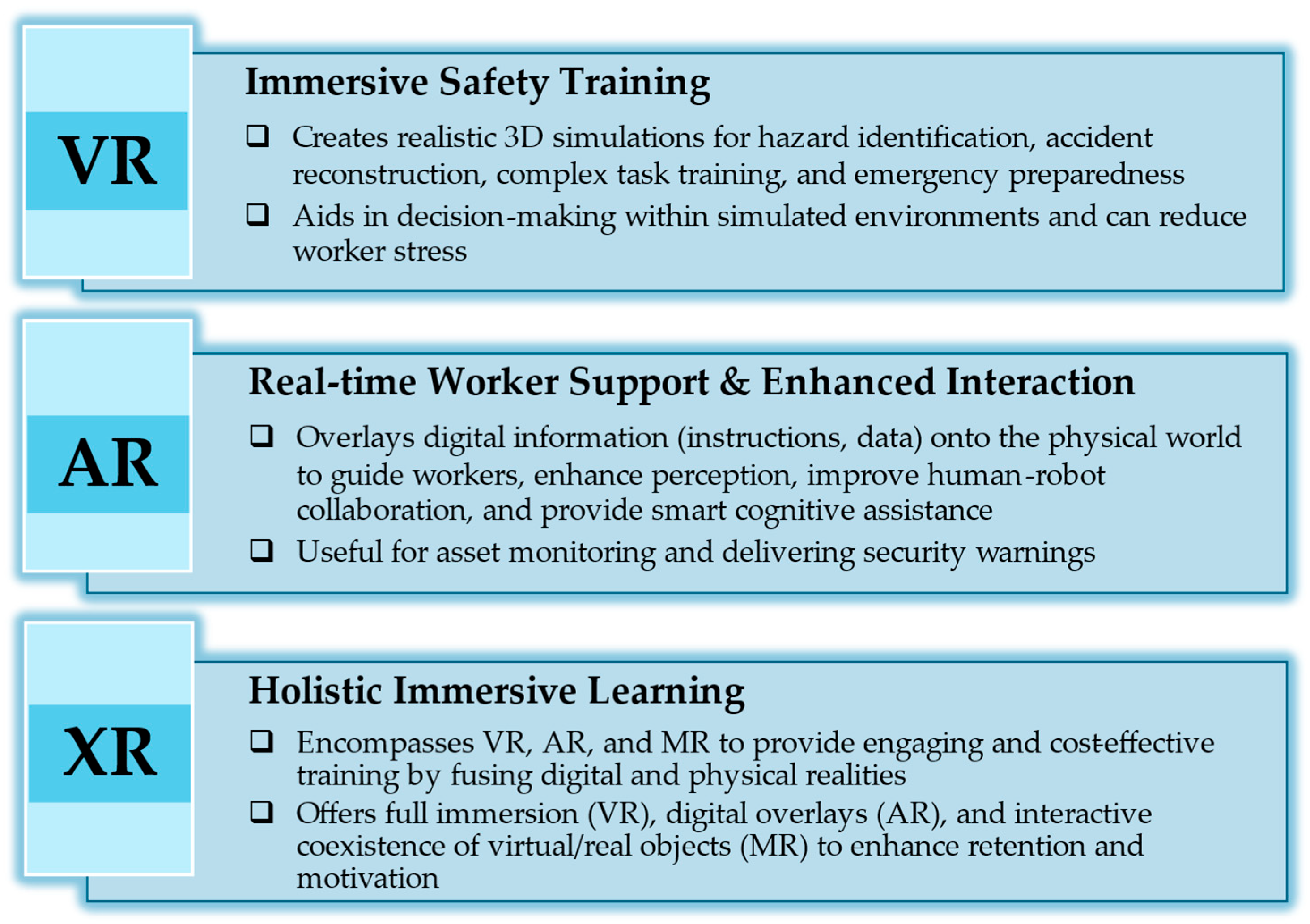 64]. Moreover, human factors play a crucial role, as traditional skills may not directly translate to using innovative technologies, and there is a concern that workers’ natural instinctive responses to abnormalities might be delayed or ignored in virtual environments [