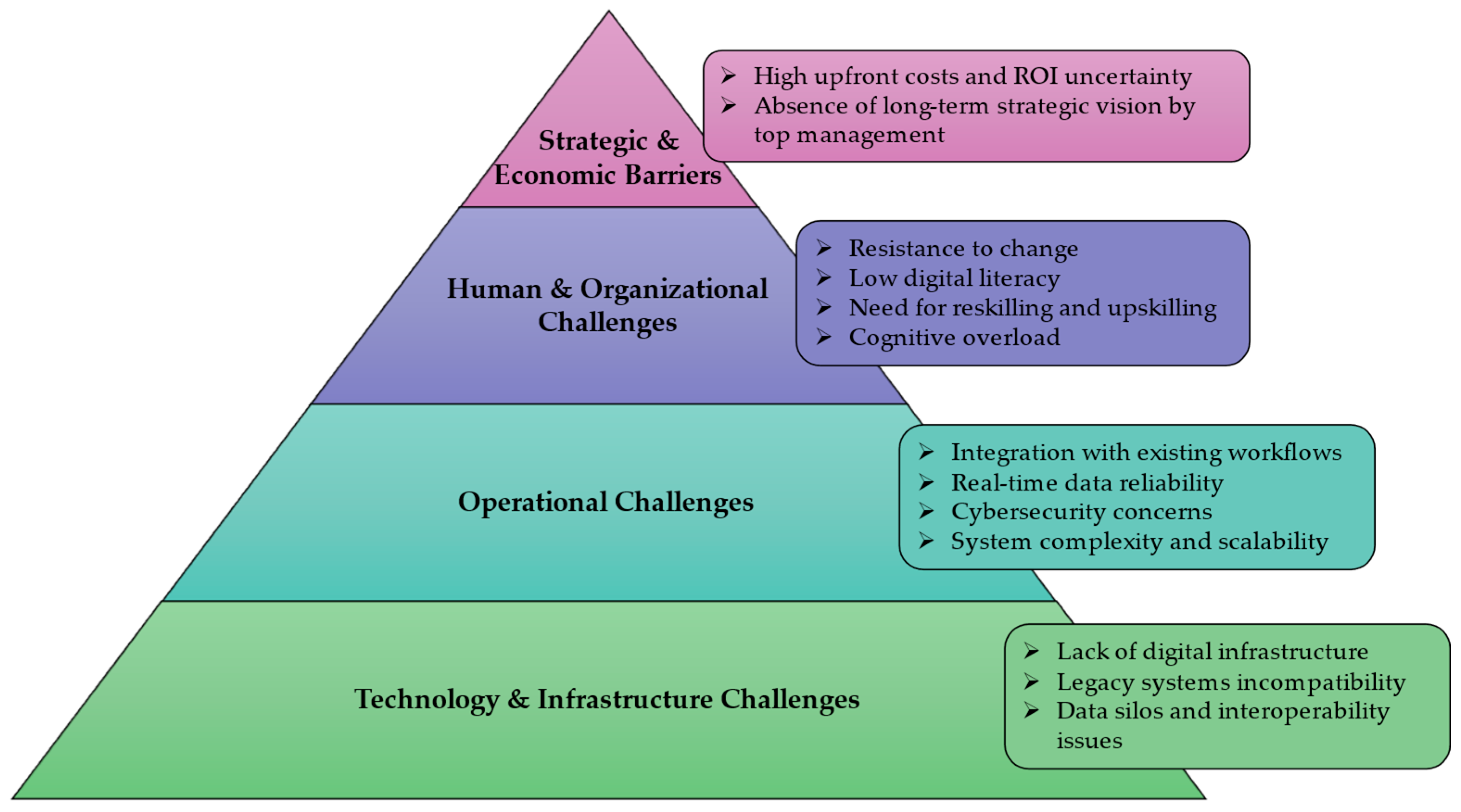 At the base, Technology & Infrastructure challenges are especially prevalent among SMEs, which often lack the digital maturity required for DT and IM integration. Inadequate IoT networks, limited real-time data capabilities, and outdated legacy systems contribute to fragmented data environments and hinder synchronization efforts, as highlighted in the literature. These foundational gaps create significant barriers to the deployment of responsive, real-time safety systems.
