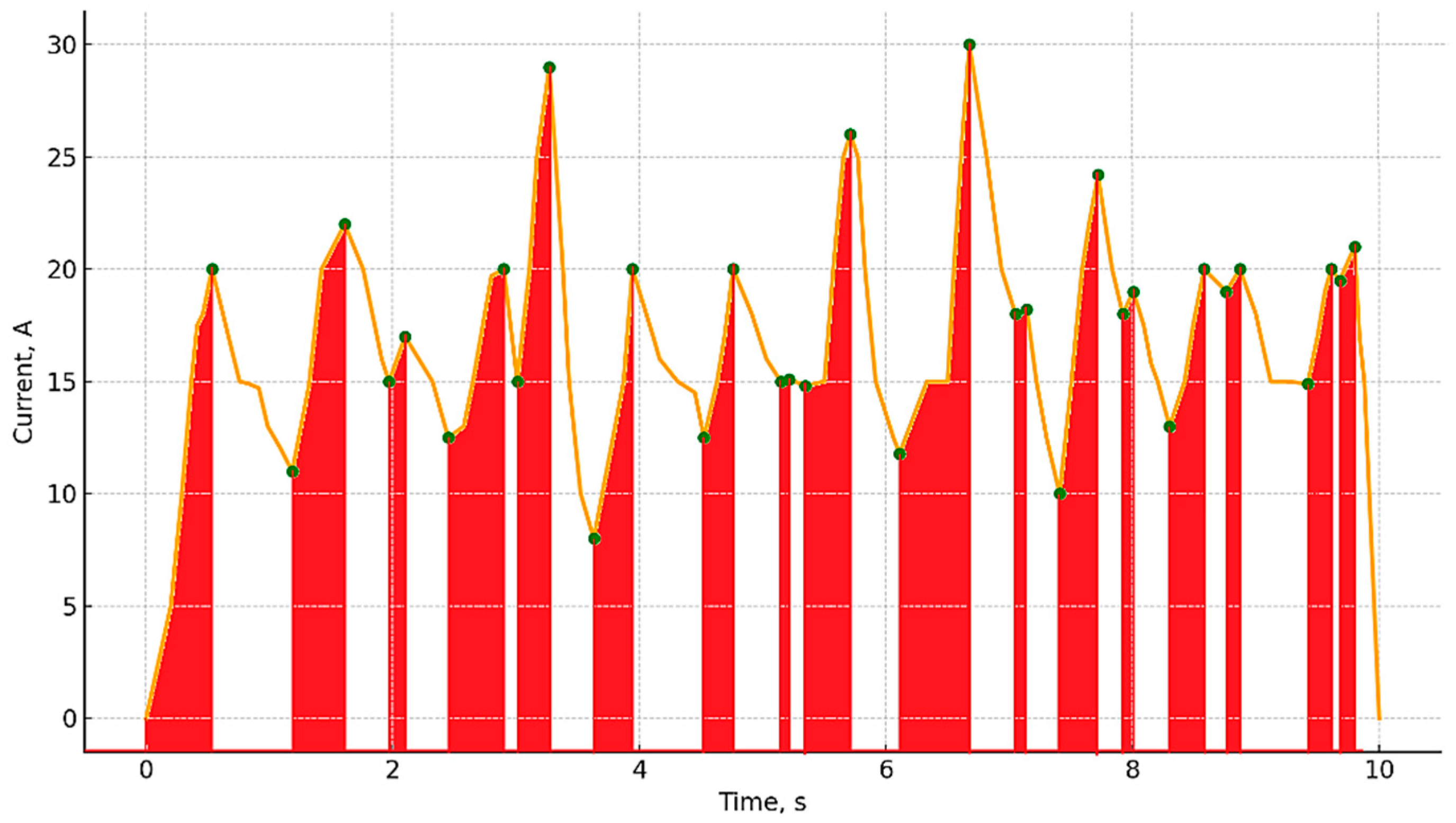 Figure 7). Therefore, the average number of pulses in the process can be approximately estimated by the number of pronounced local current maxima within the time interval of processing. Between two adjacent peaks, there are characteristic sections that reflect the vapor–gas shell accumulation stage. This stage is visualized as an interval from a local minimum to the subsequent maximum and can be interpreted as a gradual increase in resistance due to the formation and growth of the shell (red area on the graph). The discharge itself occurs when this shell is broken through and manifests itself as a local current maximum. This is followed by the recovery phase—an area on the graph from a local maximum to a subsequent minimum, reflecting the redistribution of the electric field, stabilization of the system and repeated growth of the shell. Accordingly, for each processing mode, it is possible to estimate the number N of such shell recoveries, which is subsequently used to estimate the amount of heat