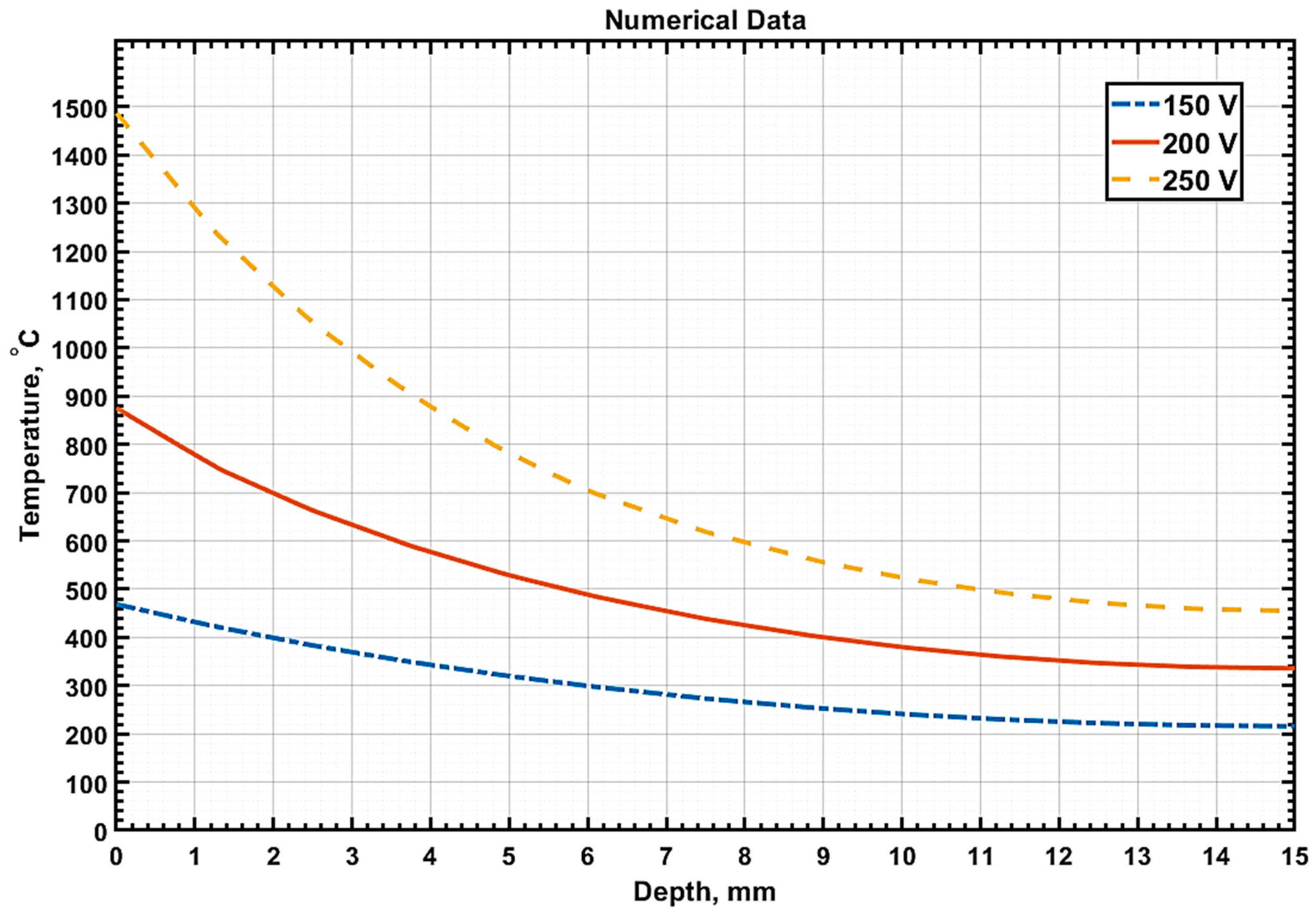 Numerical results demonstrated that accounting for radiation led to a measurable reduction in the calculated surface temperature at U = 250 V, from 1518.5 °C to 1490.6 °C—a difference of approximately 28 °C (1.84%). In contrast, the effect was negligible for lower voltages: 5.9 °C (0.67%) for 200 V, and 1.2 °C (0.25%) for 150 V.