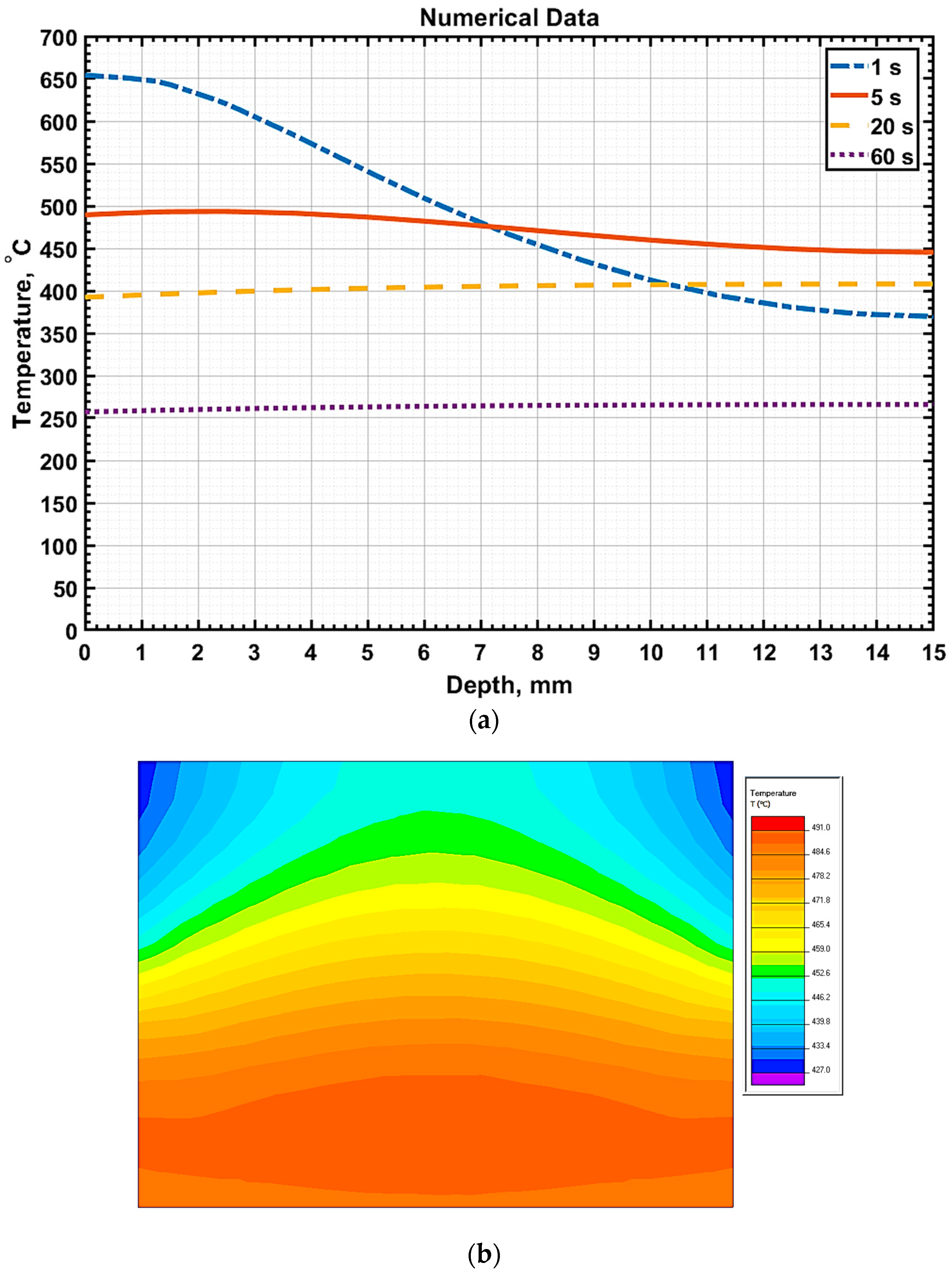 To ensure a valid comparison, the numerical calculation results were analyzed at a depth of 2 mm, consistent with the experimental temperature measurements obtained using a thermocouple. However, the interpretation of experimental data must consider the inherent measurement inertia; the MEGEON26003 thermocouple’s response time is approximately 4 s, according to its technical specifications. Consequently, the thermocouple readings may lag behind the actual temperature of the sample, particularly under the rapid heating conditions characteristic of electrolytic plasma hardening.