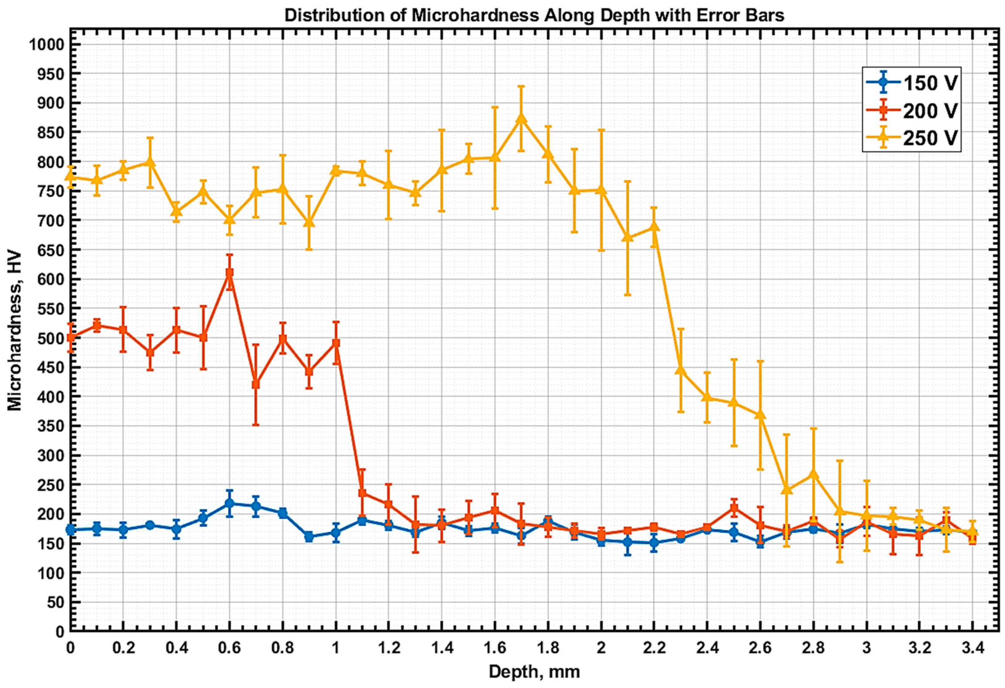 Figure 10) clearly shows how the hardening of 20GL steel depends on the electrolytic plasma treatment mode. Initially, the samples had a microhardness of approximately 150–160 HV. The cross-section for measurement was made at a distance of approximately 5 mm from the edge of the sample. At 150 V, hardening is minimal, with a maximum hardness of about 200 HV. This aligns with the calculated temperature of less than 400 °C at a depth of 2 mm, indicating an inability to reach the critical temperature required for phase transformations. At 200 V, a notable increase in microhardness to 500 HV occurs in the surface zone, followed by a sharp decline after 1 mm of depth. Although the numerical temperature distribution predicts heating to 700–800 °C at a depth of 1–2 mm, the reduction in hardness suggests an inadequate cooling rate in these layers, which restricted the formation of bainite or martensite structures. The most substantial strengthening is observed at 250 V, where high microhardness (750–850 HV) is sustained in the zone up to approximately 2.2–2.4 mm. This aligns with calculations showing that the temperature at this depth exceeded 750 °C, and the cooling rate (>50 °C/s) was sufficient to develop a martensitic structure. Therefore, for 20GL steel, which has limited hardenability, the effective strengthening depth depends not only on the heating temperature but also on achieving critical cooling rates, especially during high-voltage EPH.