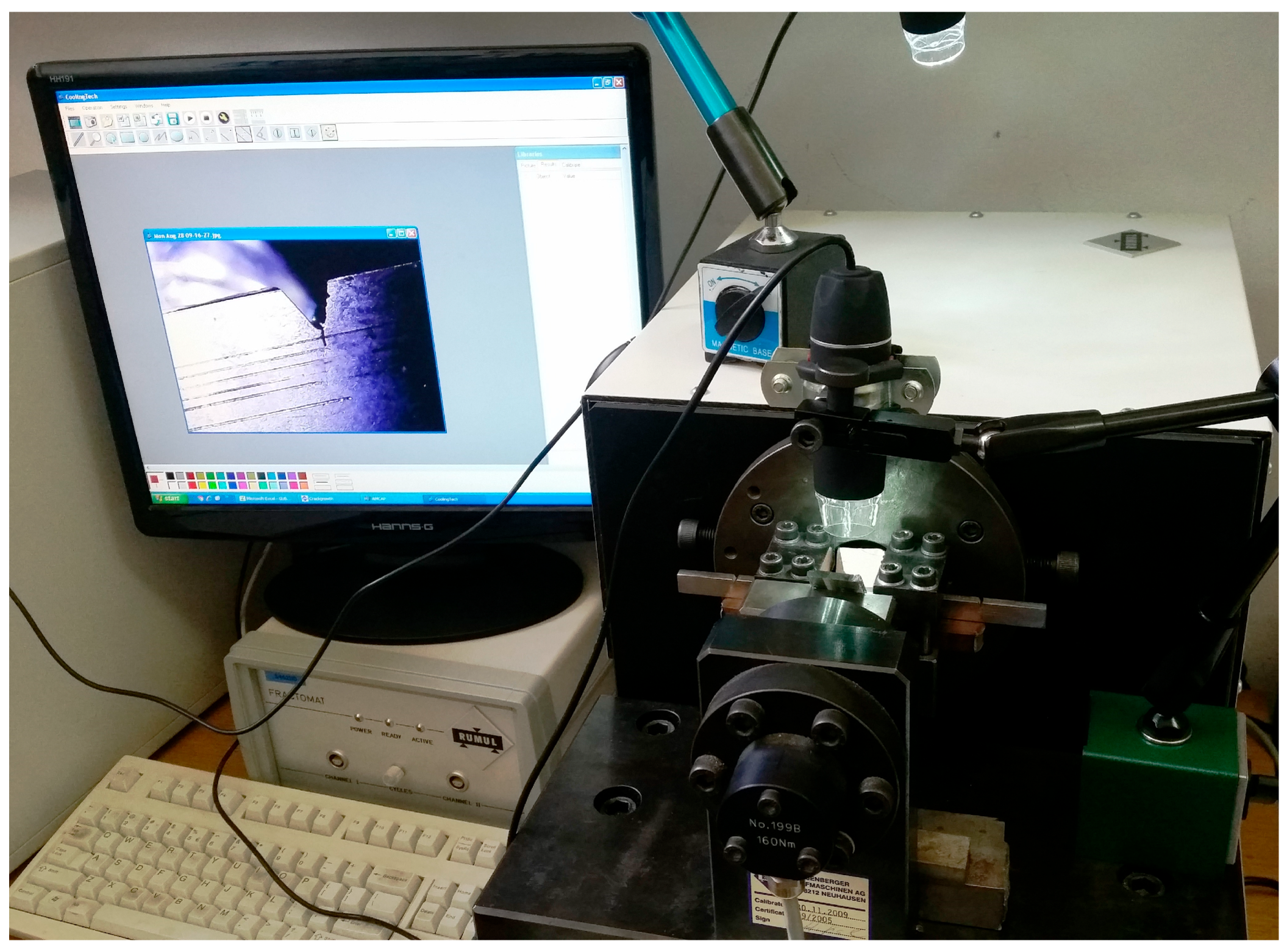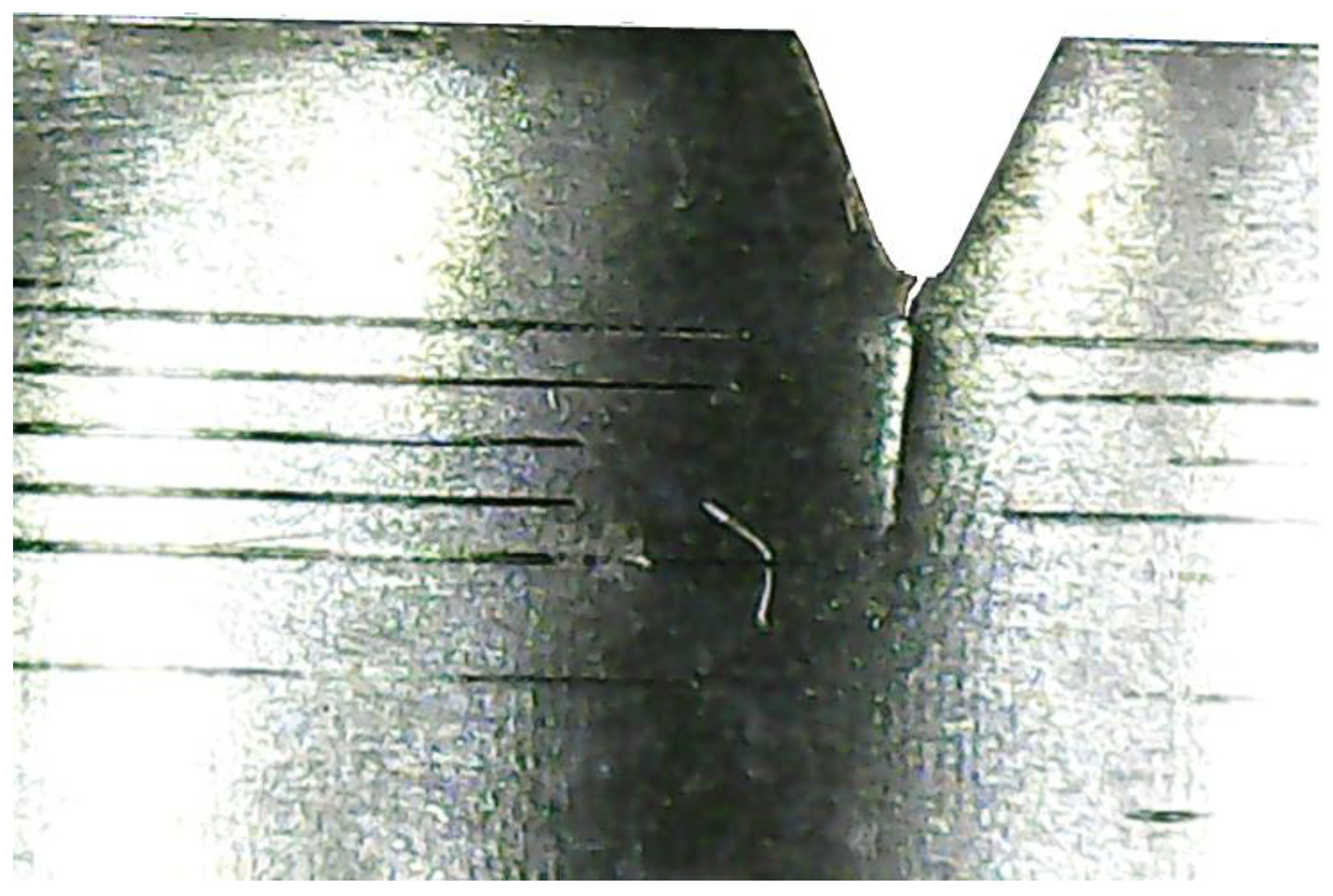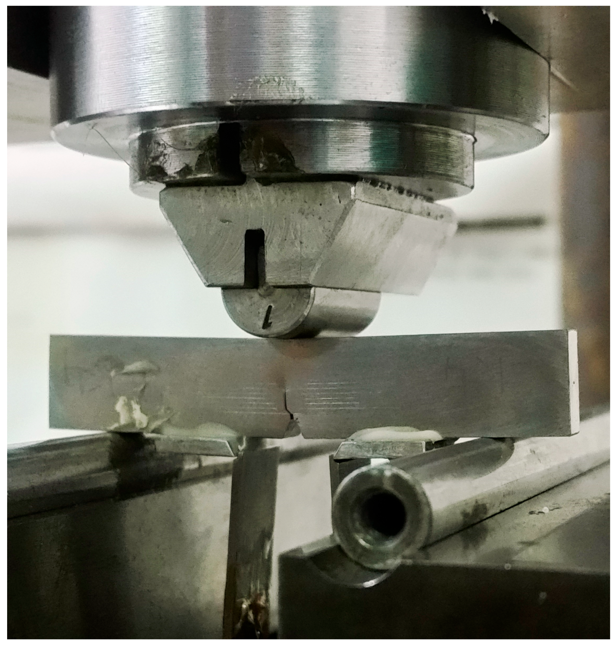- using the maximum force applied to the test specimen, it is possible to calculate the fracture toughness value of the material, i.e., for F = Fmax, KI = Kc. This experiment was performed on Instron 1255 universal testing machine. The fracture surfaces of the specimens were observed using a microscope at 20× magnification, and the notch root diameters were measured after fracture, as presented in the Results section.
