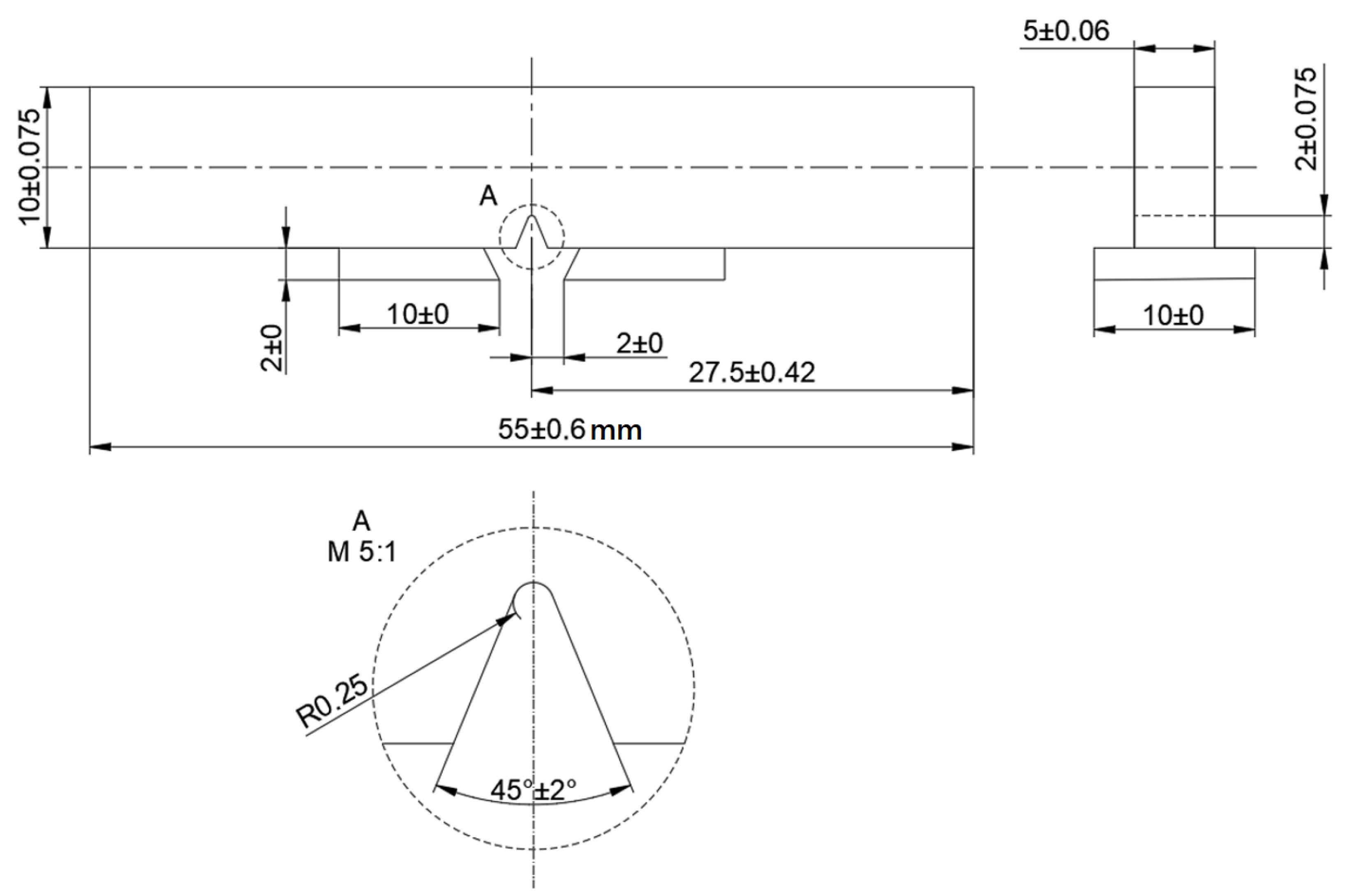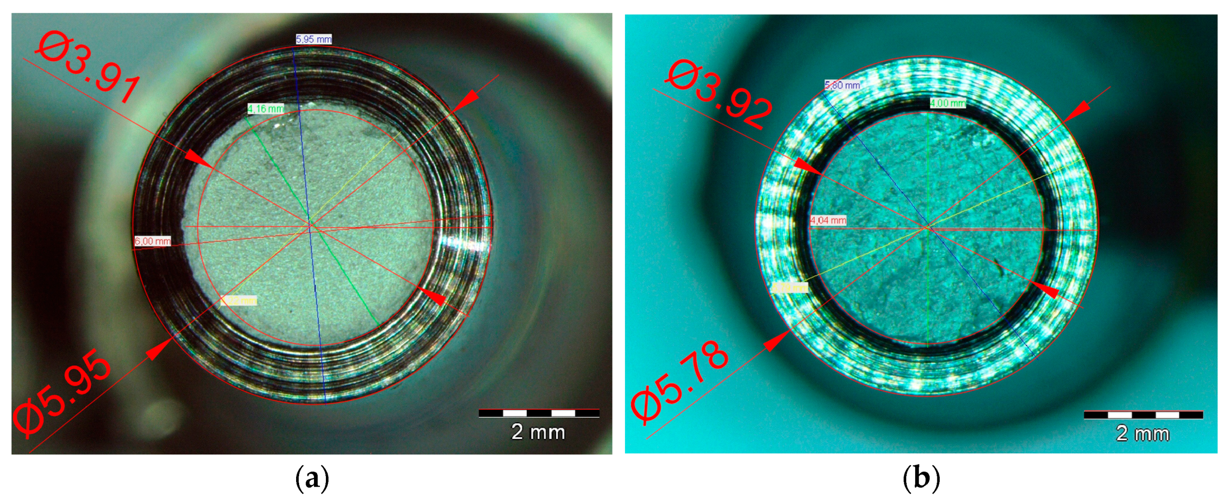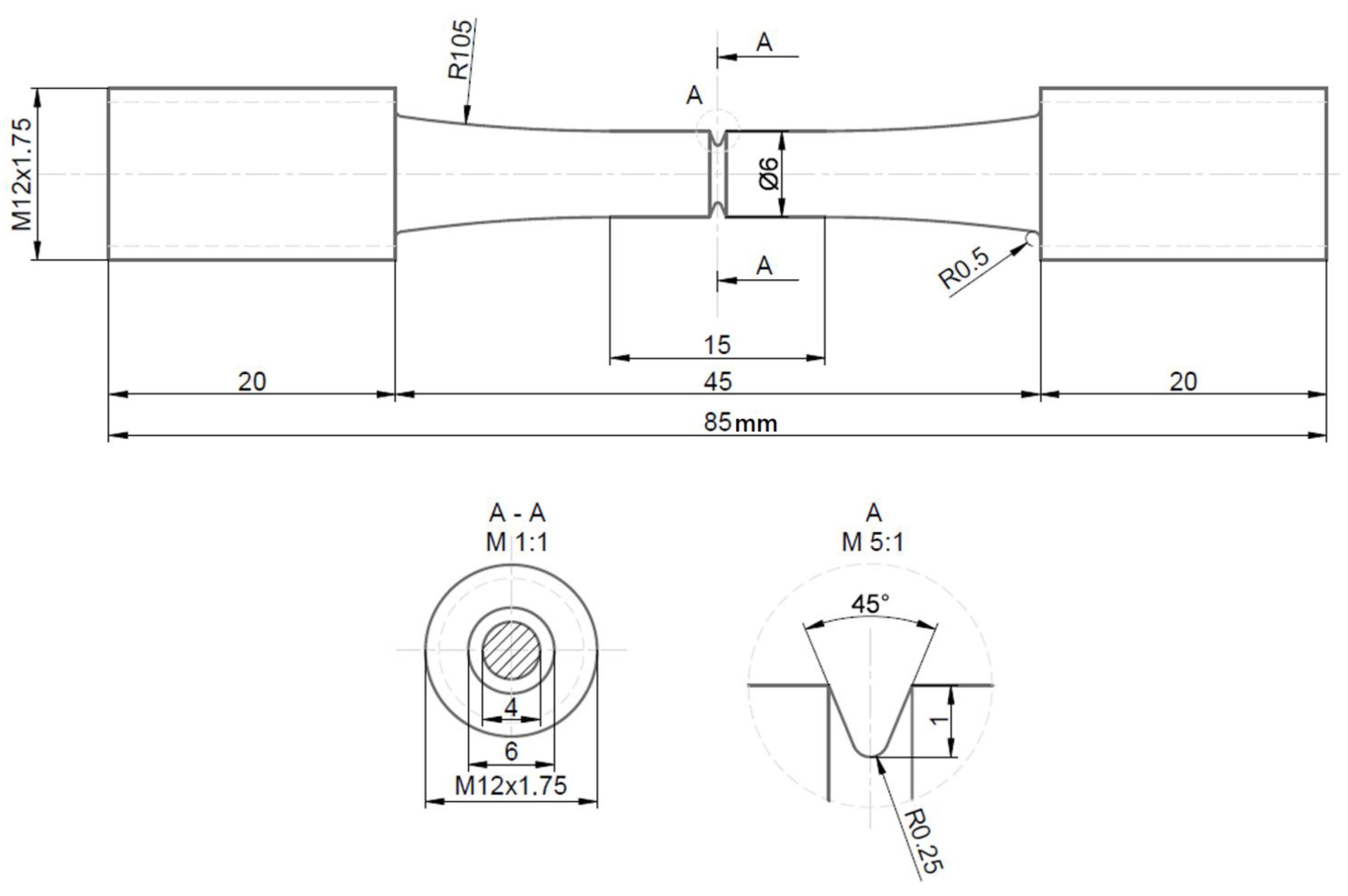 - using the maximum force applied to the test specimen, it is possible to calculate the fracture toughness value of the material, i.e., for F = Fmax, KI = Kc. This experiment was performed on Instron 1255 universal testing machine. The fracture surfaces of the specimens were observed using a microscope at 20× magnification, and the notch root diameters were measured after fracture, as presented in the Results section.