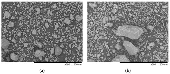 A general-purpose-type OPC, according to ASTM C150 [] was used as the primary binder. The CS used as SCM was sourced from a Codelco’s Ventanas smelter, Chile, part of the world’s largest copper-producing company. Given the coarse particle size of the as-received CS (Figure 1), it was ground to a finer form prior to its use in the mixtures. Table 1 presents the chemical composition of both the OPC and the CS, determined by X-ray fluorescence (XRF). It can be observed that the CS contains significantly higher amounts of Fe2O3 and SiO2 compared to those presented in the OPC. Figure 2 shows the SEM micrographs of OPC and CS particles, revealing angular, irregularly shaped particles with a wide range of sizes.