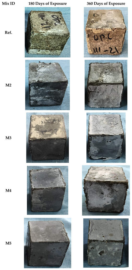 Visual inspection was conducted by analyzing photographic records of 5 × 5 cm cubic specimens corresponding to the different concrete mixtures, captured after 180 and 360 days of exposure. The samples were immersed in a 5% MgSO4 solution, allowing the documentation of surface-level physical changes observed at both exposure durations. These changes included surface disintegration.