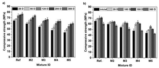 The compressive strength was evaluated for concrete mixtures cured in water and exposed to a MgSO4 solution at selected ages, as shown in Figure 4 (where bars indicate mean values, while error bars indicate one standard deviation above and below mean values). Figure 4a shows the results obtained for concretes cured for 28, 56, 128, 128, 208 and 388 days. As expected, an increase in curing age leads to an improvement in the compressive strength of all mixtures. However, this mechanical property decreased monotonically as the RCA content increases, at all curing ages. Specifically, at early curing ages such as 28 and 56 days, when comparing the Ref. mixture (100% virgin materials) with M2 (containing 15% CS as SCM), the compressive strength decreased by 8.44% and 7.78%, respectively. At later curing ages, such as 208 and 388 days, mixture M2 achieved average compressive strengths of 70.62 MPa and 73.62 MPa, respectively. These values were only 5.9% and 4.0% lower than those of the Ref. mixture, indicating a reduced difference in mechanical performance over time. This behavior is attributed to the pozzolanic effect of the CS, which is known to be only moderately reactive and requires extended curing periods for its beneficial effects to become more evident [,]. Similar findings were reported by Wang et al. [], who incorporated CS as SCM in proportions ranging from 10 to 20 wt% for mortar production. Their study showed a reduction in compressive strength at early ages (3, 7, and 28 days), which was attributed to the poor hydrophilicity of the material. This condition increases the amount of free water in the mixture and reduces the formation of hydration products. Despite its lower reactivity compared to OPC, mixtures incorporating up to 15% CS exhibit improved mechanical performance at extended ages [].