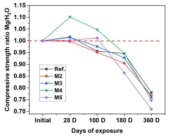 Compressive strength ratio of concretes exposed to MgSO4 and cured in water (Red dashed line indicates equal compressive strength for water curing and sulfate exposure).